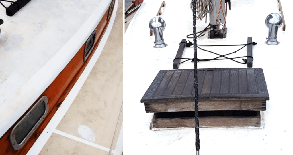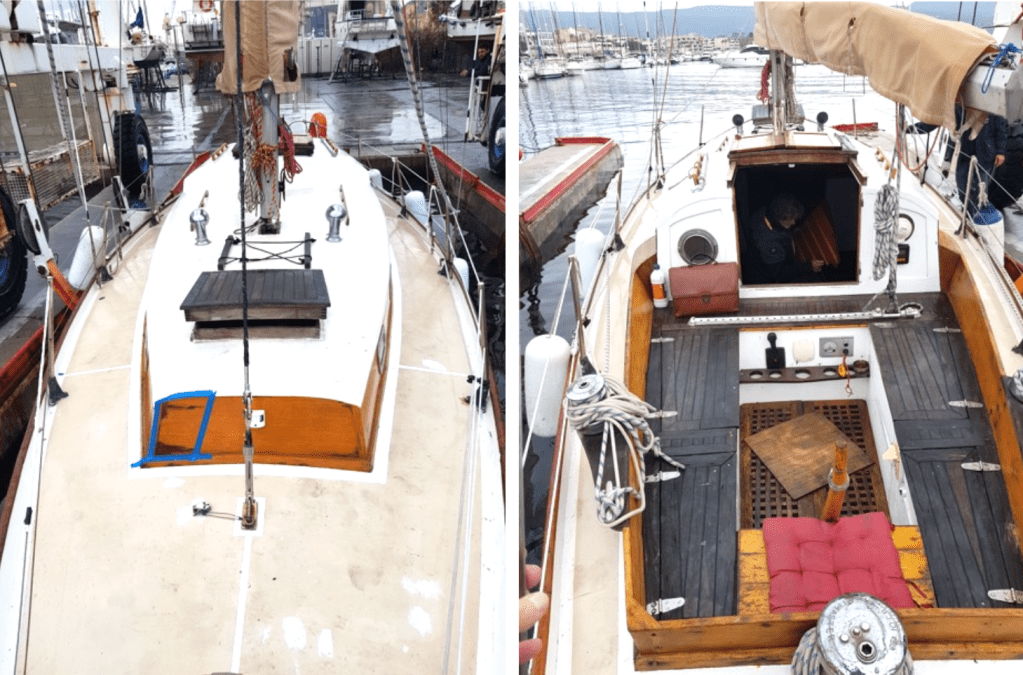 – Pont, Roof et cockpit sont en relativement bon état, mais nécessiteraient quelques travaux de peinture et vernis. Travaux à prévoir sur des infiltrations d’eau au niveau du capot de roof et de certains hublots.